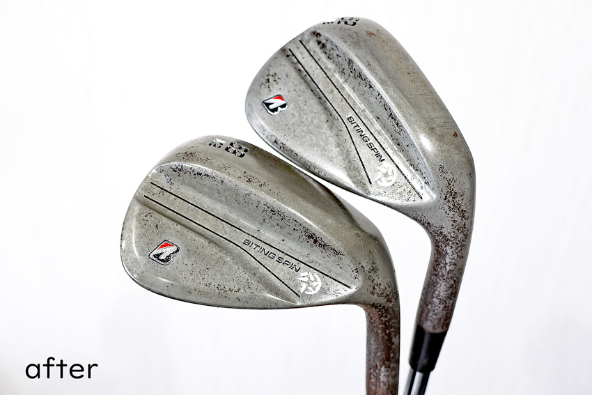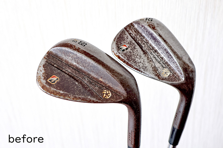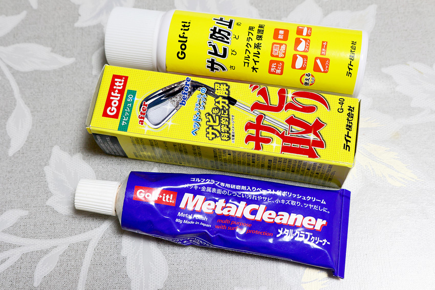 超雨男が持つノーメッキアイアンは常にサビとの戦い。持つべきではなかったのに「ノーメッキ」という響きにやられてしまったのです(笑)ブリヂストン・ゴルファーズドックの担当者が「普通のお手入れなら“Golf it! メタルクラブクリーナー( G-205)”と“Golf it! サビ防止(サビ止め G-63)”で十分ですよ」と教えてくださったのですが、それはあまり雨に降られない人のことだったのでしょう(知らんけど)。で、どうしようもなく錆びてしまったアイアンをどうにかしたい。「Golf it! サビッシュ50(G-40)」を購入してみました。サビを科学的に分解するゴルフクラブ専用サビ取り液です。直接塗布して4~5分放置するだけ(程度によっては20分まで放置時間を調整可能)。酷い状態だったので歯ブラシで軽くこすって約10分を2セット、使用前・使用後の写真をご覧の通り「結構効果あり」。細部についても何度か繰り返すと消えるかな?時間に限りがあったのでサビ止めを塗って作業を終えました。注意点は保護用眼鏡とゴム手袋は必須、室内でやる場合は要換気、新聞紙などを敷いてテーブルや床などに垂れないようにすること。用法を守ればとても良い商品、サビでお悩みの方は試してみる価値ありです。